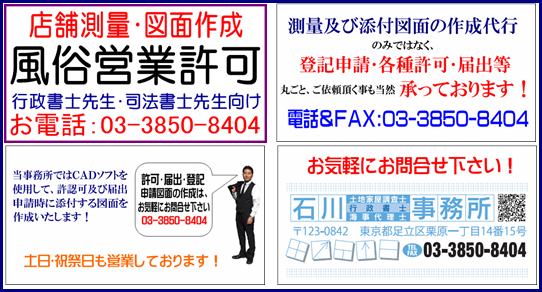 足立区風俗営業許可図面、葛飾区風俗営業許可図面、江戸川区風俗営業許可図面、板橋区風俗営業許可図面、豊島区風俗営業許可図面、北区風俗営業許可図面、荒川区風俗営業許可図面、練馬区風俗営業許可図面、千代田区風俗営業許可図面、中央区風俗営業許可図面、文京区風俗営業許可図面、港区風俗営業許可図面、台東区風俗営業許可図面、墨田区風俗営業許可図面、江東区風俗営業許可図面、品川区風俗営業許可図面、大田区風俗営業許可図面、世田谷区風俗営業許可図面、渋谷区風俗営業許可図面、目黒区風俗営業許可図面、新宿区風俗営業許可図面、中野区風俗営業許可図面、杉並区風俗営業許可図面、草加市風俗営業許可、越谷市風俗営業許可